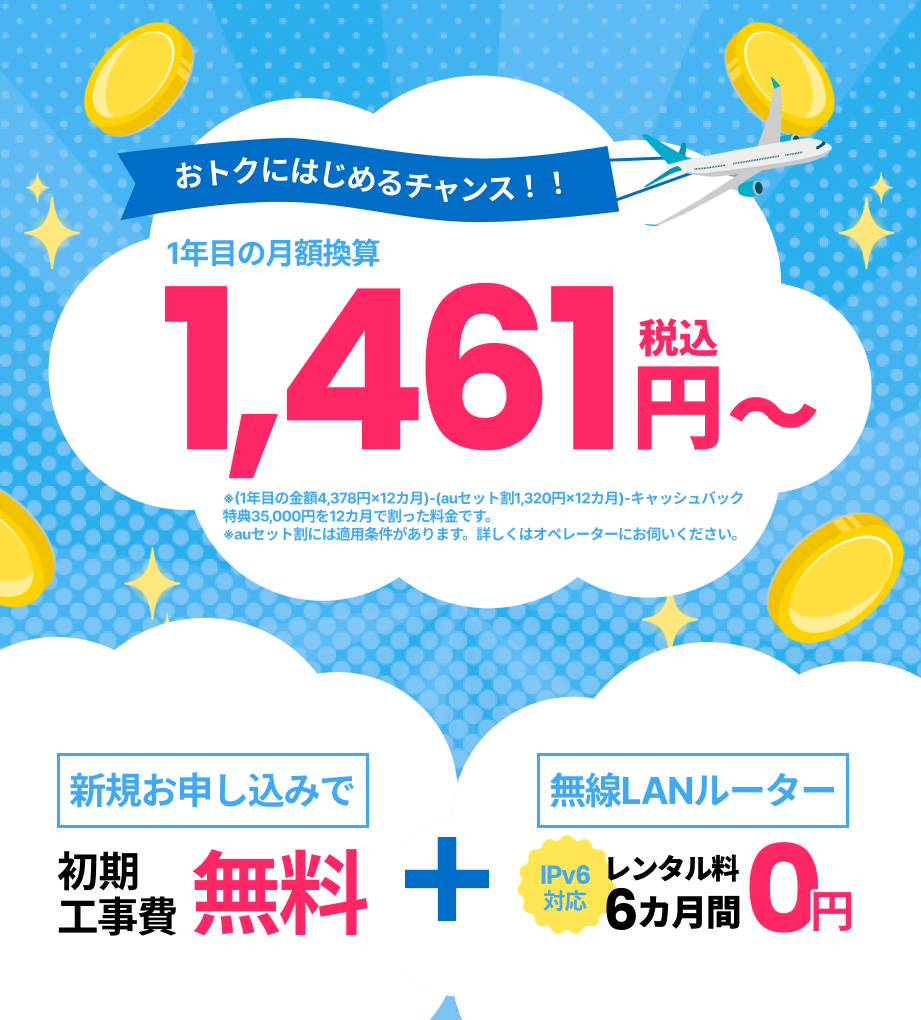 ※1 (1年目の金額4,378円×12カ月)-キャッシュバック特典35,000円を12カ月で割った料金です。