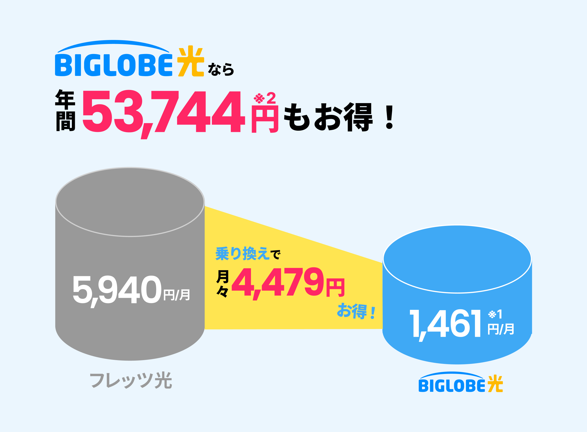 さらにいままでお使いのインターネットからBIGLOBE光に契約変更することで、ぐっと月額利用料を抑えることが可能です!